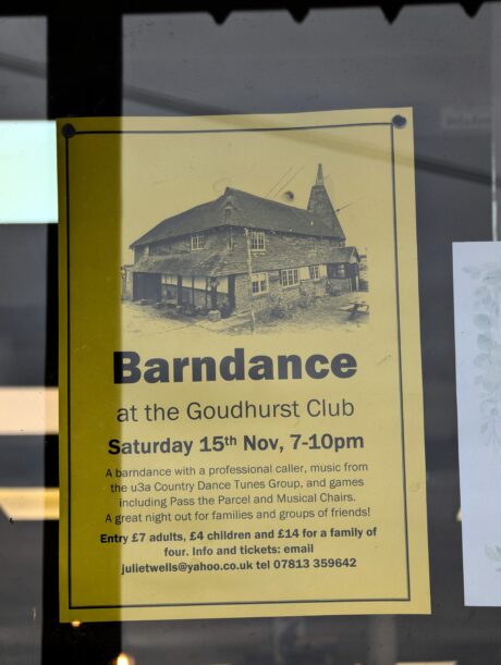 - The regular tunes meeting at the Goudhurst Club starts at 10.30am on Monday 3rd November. This will be a practice ahead of the barndance. Written music can be found on the Country dance tunes meetings and workshops page and there are steady-speed demonstrations of the tunes on my YouTube account https://www.youtube.com/@GavinAtkin